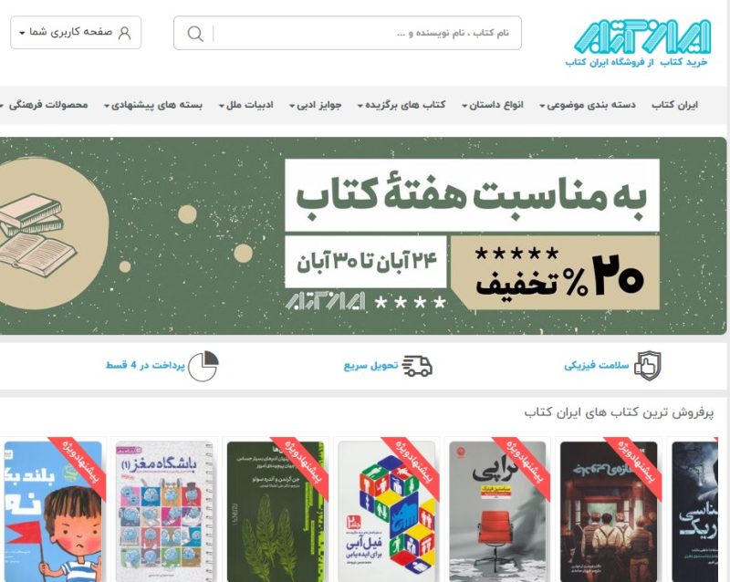اولین چیزی که در سایت توجهم را جلب میکند، هدر صفحه اصلی است که هر دفعه حرف تازهای برای گفتن دارد. مثلا تخفیفهایی که به مناسبتهای مختلف میدهد یا تازههای کتاب از اینجا قابل دسترسی است. گاهی هم اگر برنامهٔ خاصی مثل مسابقهٔ نویسندگی یا کتابخوانی در حال برگزاری باشد، توی این هدر میتوانید بهراحتی به آن دسترسی داشته باشید. مثلا الان از ۲۴ تا ۳۰ آبان ۱۴۰۳ هفتهٔ کتاب و کتابخوانی است و تمام کتابهای ایران کتاب شامل ۲۰ درصد تخفیف هستند.